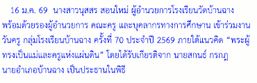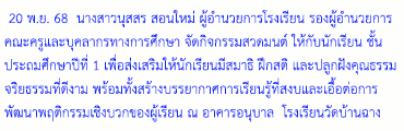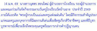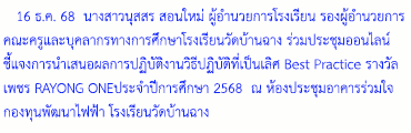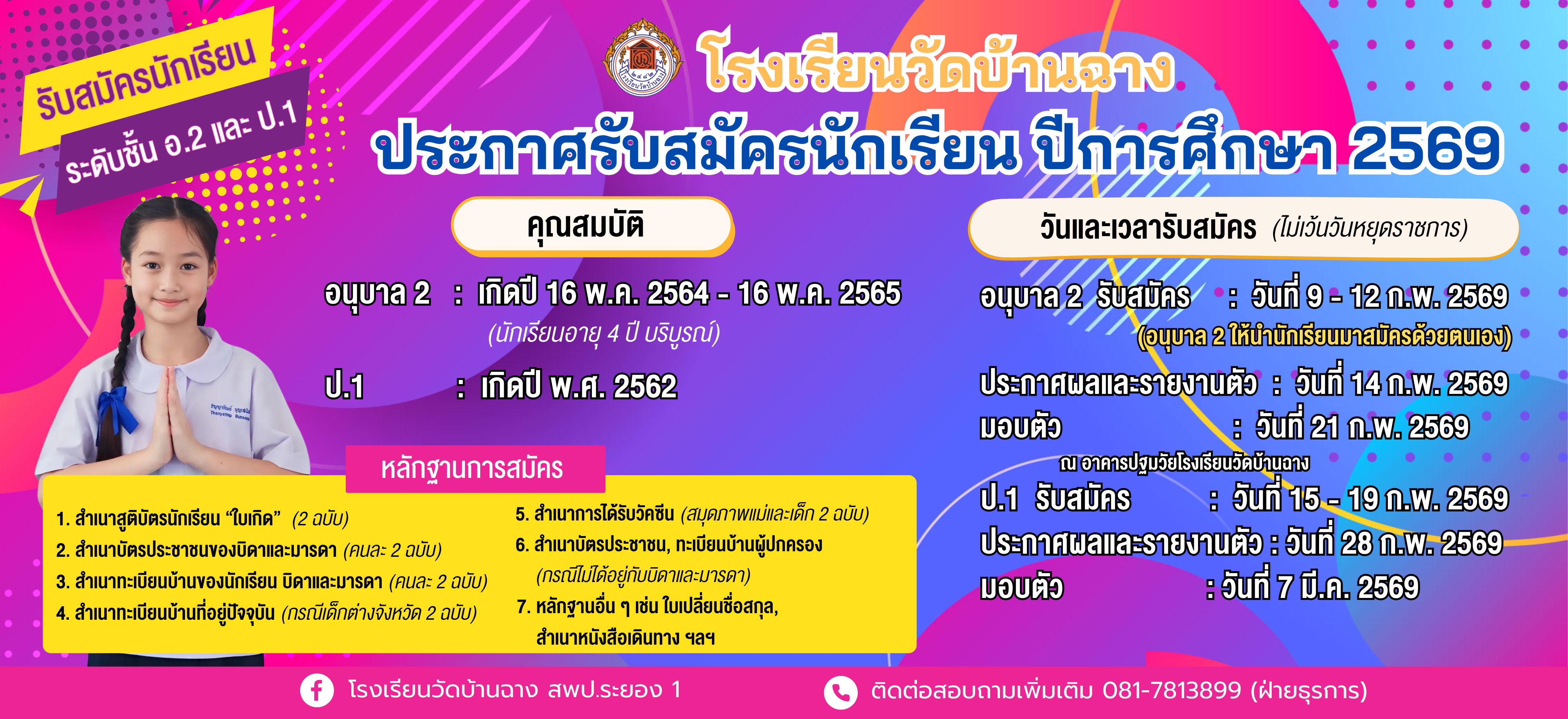 รับสมัครนักเรียนปีการศึกษา 2569 เจตจำนงในการบริหารงานของโรงเรียนวัดบ้านฉาง นโยบายการไม่รับของขวัญและของกำนัลทุกชนิดจากการปฏิบัติหน้าที่ ประกาศรายชื่อนักเรียนประจำปีการศึกษา 2568 มาตรการป้องกัน แก้ไขปัญหาฝุ่นละอองขนาดเล็ก คู่มือและเอกสารโรงเรียนคุณธรรม สพฐ. เชิญชวนผู้มีส่วนได้ส่วนเสียภายนอกร่วมประเมินคุณธรรมความโปร่งใส