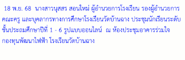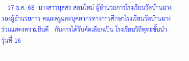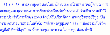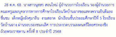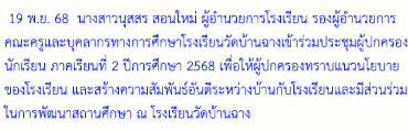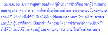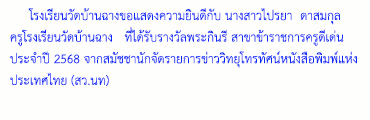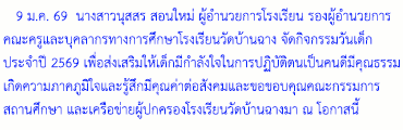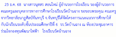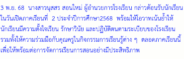 รับสมัครนักเรียนปีการศึกษา 2569 เจตจำนงในการบริหารงานของโรงเรียนวัดบ้านฉาง นโยบายการไม่รับของขวัญและของกำนัลทุกชนิดจากการปฏิบัติหน้าที่ ประกาศรายชื่อนักเรียนประจำปีการศึกษา 2568 มาตรการป้องกัน แก้ไขปัญหาฝุ่นละอองขนาดเล็ก คู่มือและเอกสารโรงเรียนคุณธรรม สพฐ. เชิญชวนผู้มีส่วนได้ส่วนเสียภายนอกร่วมประเมินคุณธรรมความโปร่งใส